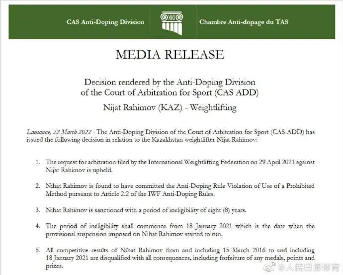 洛桑当地时间22日,国际体育仲裁法庭(CAS)在官网发布公告称,由于哈萨克斯坦举重运动员拉希莫夫违反相关反兴奋剂规定,自2021年1月18日始被禁赛八年,同时,他在2016年3月15日至2021年1月18日期间的所有比赛成绩均不合格,他在此期间的所有奖牌、分数和奖品也将被收回。