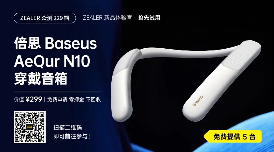 能戴在脖子上的音箱你见过吗?倍思 N10 脖挂式穿戴音箱上线 ZEALER 众测!三段式分离折叠设计,展开可挂脖穿戴,折叠可当桌面音箱;138g 超轻重量 + 液态硅胶挂脖,小巧亲肤不卡脖;全景声音效 + 定点辨位声学,看片打游戏都“声”临其境...想知道体验如何?扫上方二维码或戳左下角「阅读原文」即可前往参与。