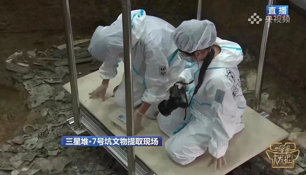 为了祭祀坑文物更好地出土,考古人员必须得趴伏在移动平台上清理文物,一工作就是几个小时。为了保护出土的象牙,他们与时间赛跑,时常挑灯夜战。