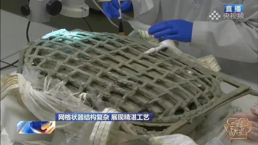 根据目前发掘和清理情况来看,龟背形网格状器上面为青铜质地的网格,网格四周有一矩形边框,边框外侧的四角又有四条向外伸出的龙头,其中两个龙头已经残毁。外侧的青铜网格是上下对称的,形成了可开合的结构。而青铜网格内部是一整块椭圆形的玉器。通过显微镜观察,在青铜网格黑色和红色区域以及内部玉器发灰色区域上都发现了明显的纺织物痕迹,经纬交错,结构明晰。而为了保证网格器能顺利提取,文保人员与现场考古队员相互配合,先将网格器底部掏空,然后用高分子绷带固定,再利用滑轮装置将网格器缓缓吊起,最终成功提取。
