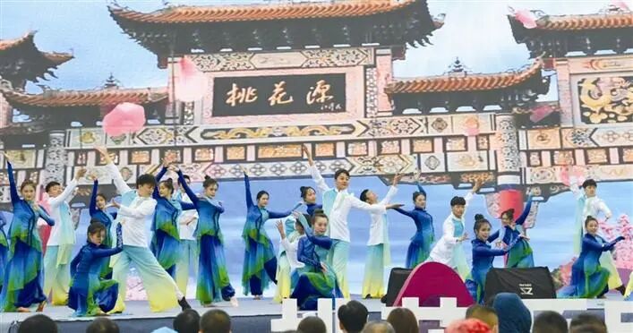 桃花源景区主游客中心,高空威亚秀《桃花源里》激情讲述东汉名将马援与桃花源的故事,《归去来兮》踏歌沅澧,描绘常德山水的诗情画意。来自全省14个市州的26个旅游文创非遗展台琳琅满目,引发游人满满的购买欲望。