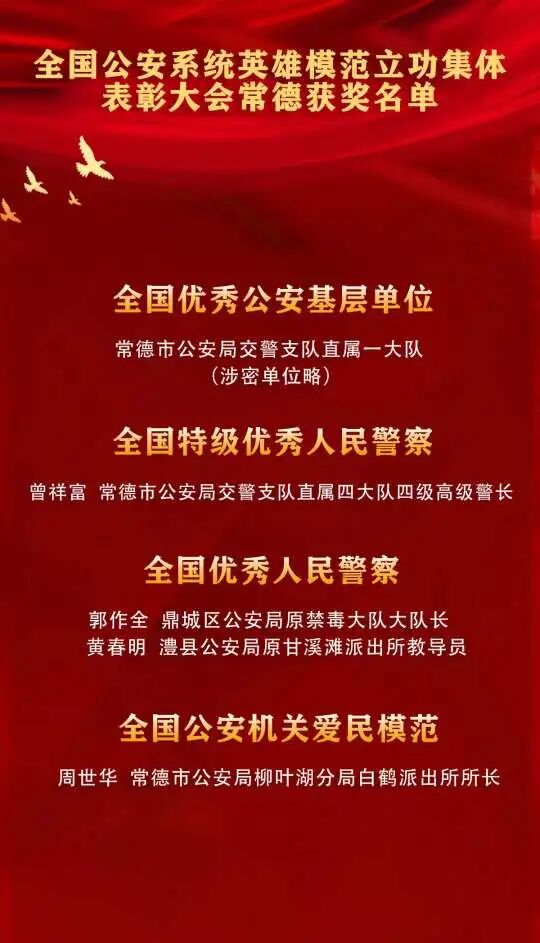 同时,鼎城区公安局原禁毒大队大队长郭作全、澧县公安局原甘溪滩派出所教导员黄春明获评全国优秀人民警察,常德市公安局柳叶湖分局白鹤派出所所长周世华获评全国公安机关爱民模范。