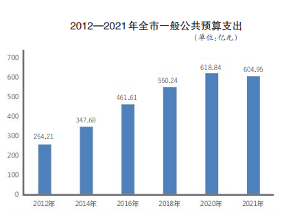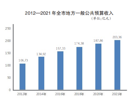 克服实体经济整体下行、“营改增”税制改革全面实行、减税降费政策持续加力及新冠肺炎疫情反复等诸多因素影响,实现了财政收入稳步快速增长。2012—2021年,全市地方一般公共预算收入从106.73亿元增长到203.36亿元,实现了从100亿元到200亿元的跨越,收入总量跃居全省第二,累计完成1582.9亿元,年均增长7.43%;一般公共预算支出从254.21亿元增长到604.95亿元,累计完成4675.18亿元,年均增长10.11%。其中,市本级地方一般公共预算收入累计完成729.99亿元,年均增长6.38%;一般公共预算支出累计完成1021.11亿元,年均增长7.66%。财政收入“蛋糕”的不断做大,有力支撑了全市经济社会各项事业的发展。![]()