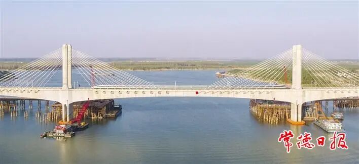 10月13日,和谐号检测车穿过常益长高铁沅江特大桥跨石长铁路拱承斜拉桥。