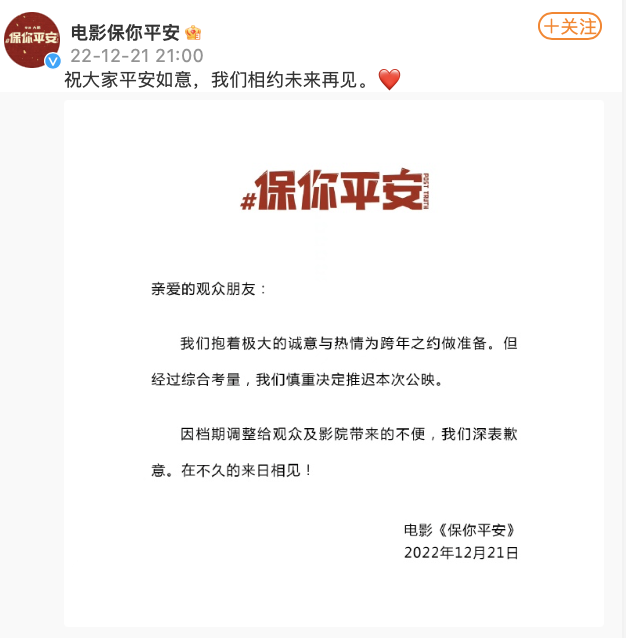 目前,已有影片开始撤档。21日晚间,“电影保你平安”官方微博称,经过综合考量,决定推迟公映。而该片此前定档跨年夜,并已经开启了宣传工作。