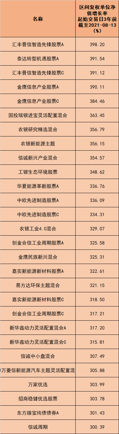 东方财富Choice数据显示,截至8月13日,近三年来有2261只基金复权单位净值增长率超过60%,1374只基金(A/C份额分开计算)复权单位净值增长率达到或超过100%。其中有28只基金三年基金净值涨了三倍。