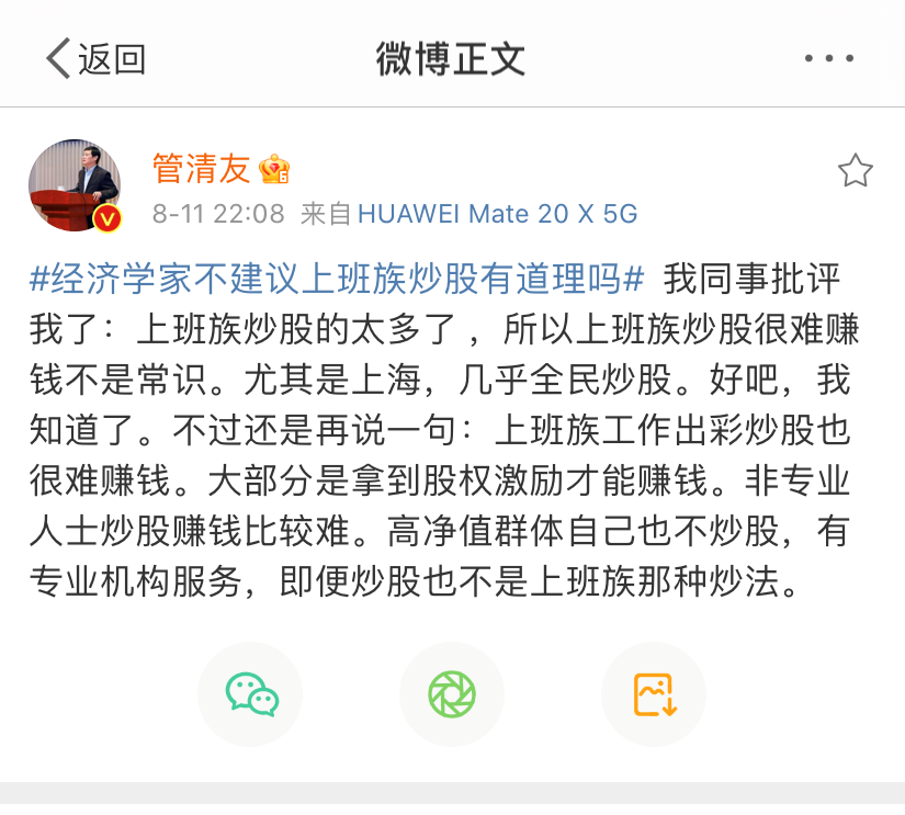 经济学家管清友在微博上公开表示,不建议上班族炒股,上班族工作出彩,炒股也很难赚钱,非专业人炒股赚钱比较难。