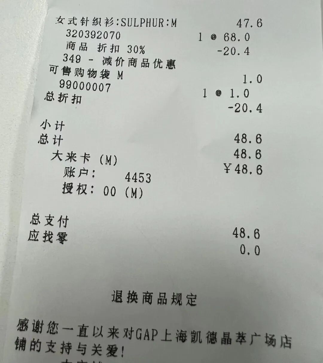 记者留意到,可能是接近闭店,前来“捡漏”的消费者络绎不绝。“看到门口清仓闭店的告示就进来看看,平时我从来没有买过GAP衣服。”在上述门店外一位90后消费者向记者表示,“碰巧路过,看到GAP的折扣挺大,就进来逛逛,‘淘到’一件短袖,原价179元,最终48.6元拿下。”