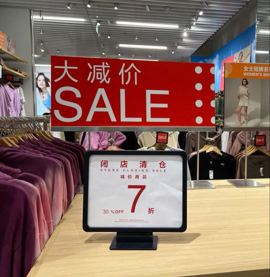 继H&M中国首店闭店尚不足两个月,近日,根据多家媒体报道,在北京、上海、长沙、南京等多地的GAP门店正在清仓甩卖,进入关店倒计时。而在小红书等相关社交平台上,“白菜价,赶紧冲”、“全场5折”、“薅羊毛捡漏”等有关GAP闭店清仓的笔记随处可见。