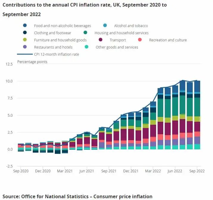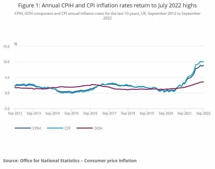 10月19日,英国统计局公布的数据显示,英国9月CPI同比10.1%,前值9.9%;同比增速重回40年最高水平。