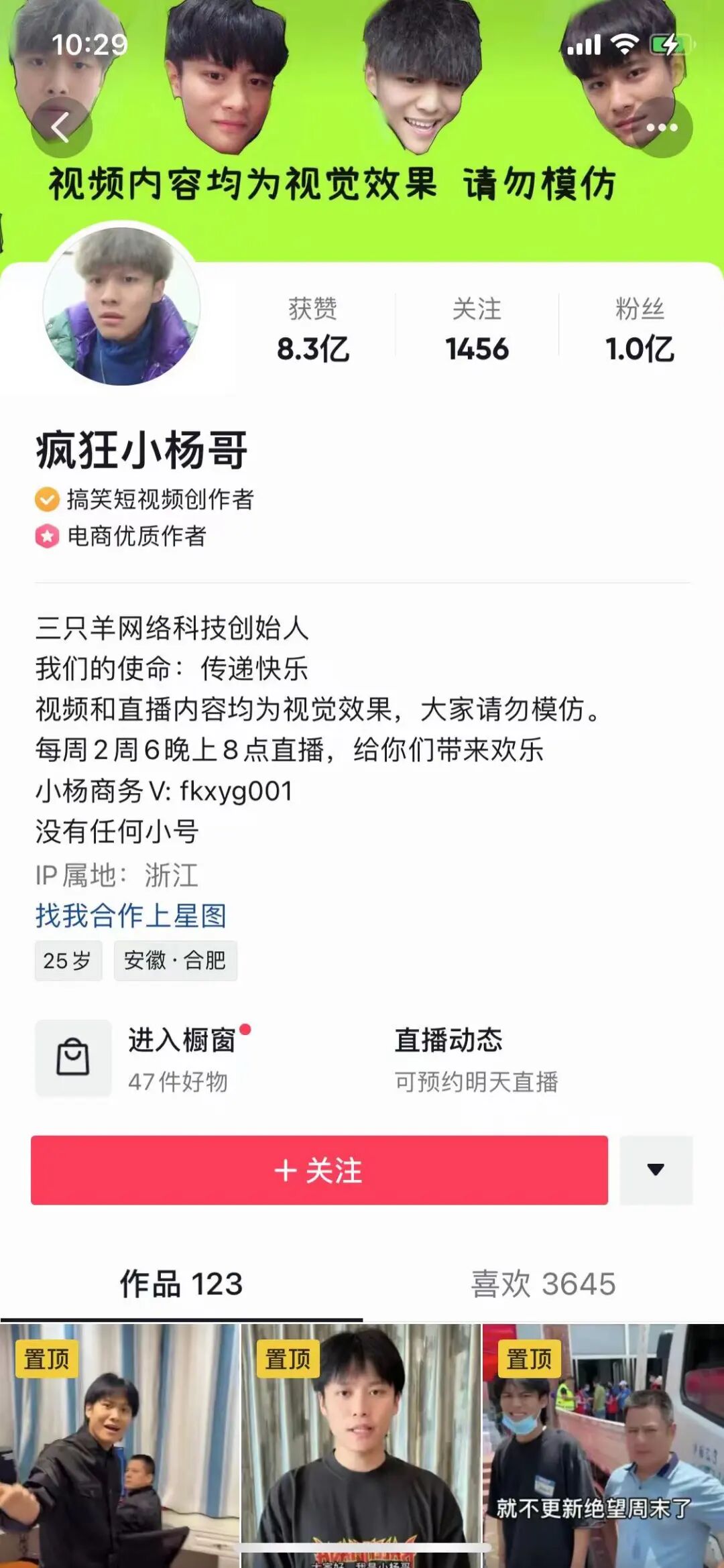 虽然现实生活中有不少人向记者表示“第一次听说‘疯狂小杨哥’”,但在互联网世界尤其是短视频平台上,“疯狂小杨哥”的确是个红人。据公开数据,小杨哥粉丝数达1.03亿,是抖音平台首位破亿粉丝达人。不仅如此,“疯狂小杨哥”还是MCN机构三只羊网络科技创始人,该MCN机构经营业务涵盖直播带货、网红孵化、切片授权、自建供应链、自营商城等电商直播业务生态。
