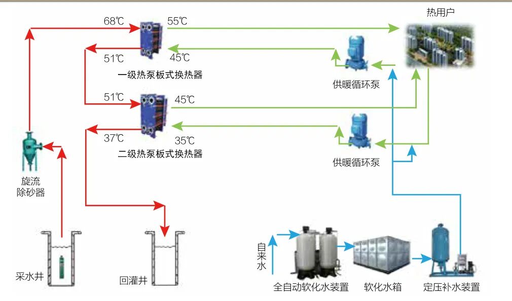 图为河北雄县人才家园地热供暖项目地热站供暖流程图。