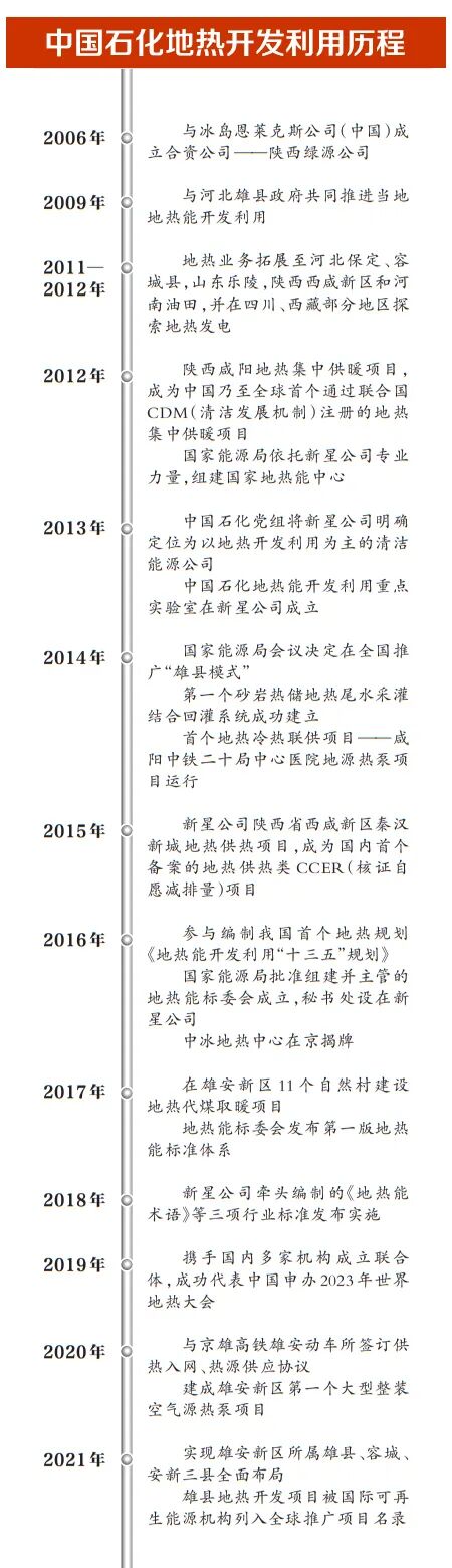 2021年,对中国石化地热业务来说,既是砥砺奋进的一年,也是“别开生面”的一年。中国石化不仅作为承办单位“接棒”第七届世 界地热大会,而且雄县地热开发项目被国际可再生能源机构列入全球推广项目名录。作为国内领军地热企业、世界最大地热供暖企业,中国 石化目前已在河北雄县、大名、故城、清河、霸州、容城、辛集,山西太原经济技术开发区,陕西武功,河南清丰等地建成 10座“地热城”,地热利用 规模达 9000万平方米。