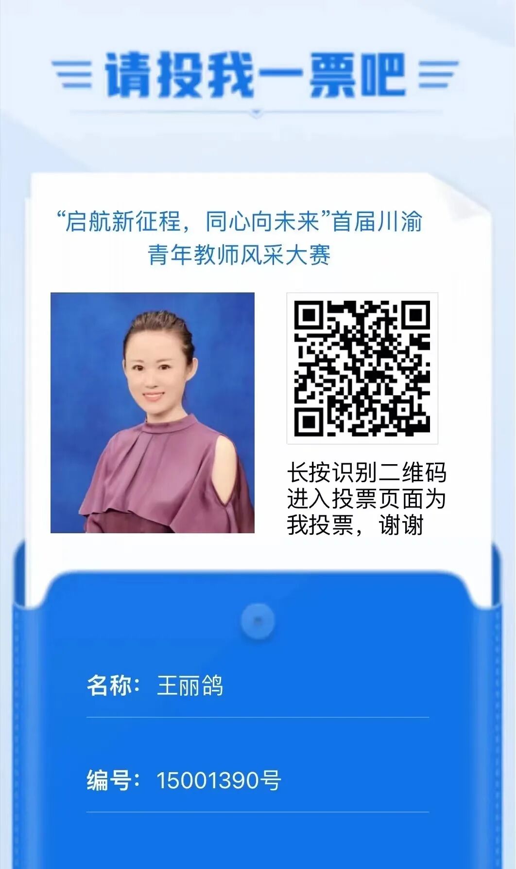 我校王丽鸽老师参加由四川省教育厅、重庆市教育委员会举办的首届川渝青年教师风采大赛,现已进入网络投票环节!