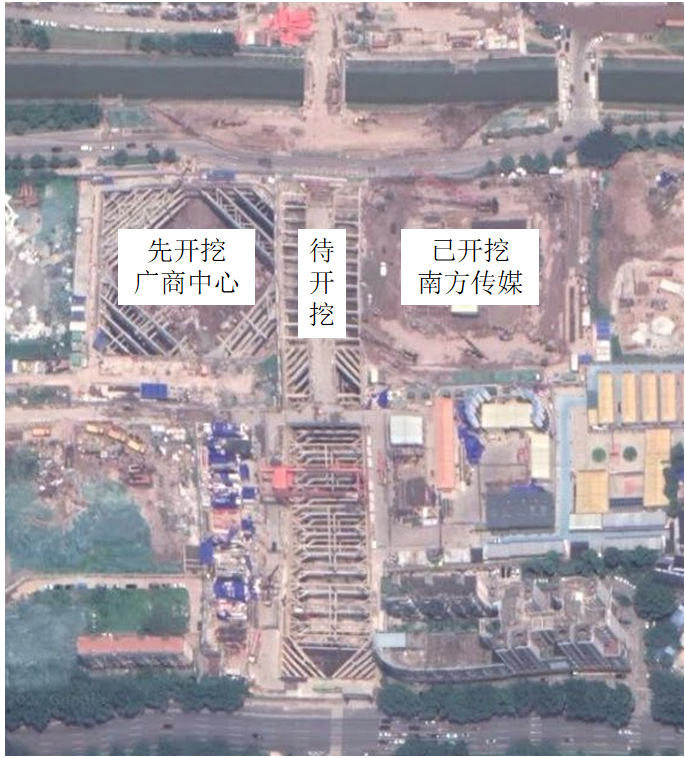 尤其是广商中心和南方传媒均为超300米超高层建筑的基坑,两基坑中间为正在施工的广州地铁十八号线的高速地铁基坑(深约30米)。根据开发顺序,这三个基坑的施工顺序为广商中心先行施工,随后18号线和南方传媒基坑同期施工,这就使得三个基坑呈现出典型的挖土、拆撑、主体施工、回填均不同步的情况,且地铁周边对施工变形控制要求高。针对该工况条件,我们在设计方案中主要采取以下措施:1)加厚地连墙,且坑间有限土体采用搅拌桩加固,以有效控制偏压引发的变形;2)三个基坑的支撑高度基本一致,以保证传力协调;3)支撑的拆换时机不同,验算最不利工况下,围护结构的抗弯剪能力。