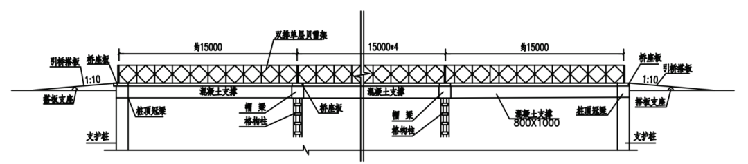 珠江大道东路、珠江大道西路横跨基坑范围的支护设计考虑了两大难题,一是满足基坑变形、稳定性要求、且开挖道路下方土体,二是保证珠江大道在基坑施工期间正常运营,最终采用内支撑上覆钢便桥结构形式。内支撑采用对撑形式,平面布置同珠江大道走向一致,调整内支撑水平间距以承受临时钢便桥的自重、车道荷载等。竖向构件为钢构柱(采用灌注桩桩基础),与内支撑组成框架体系。