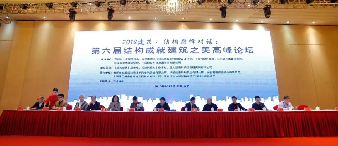 由安徽省土木建筑学会联合中国勘察设计协会高等院校勘察设计分会、上海市建筑学会、江苏省土木建筑学会、浙江省土木建筑学会、中国建设科技集团股份有限公司共同主办,《建筑结构》杂志社、《建筑技艺》杂志社、亚太建设科技信息研究院有限公司承办的“2018建筑、结构巅峰对话:第六届结构成就建筑之美高峰论坛”于2018年3月27日在合肥成功举办,来自全国各地的500多位建筑师、结构师参加了此次会议。