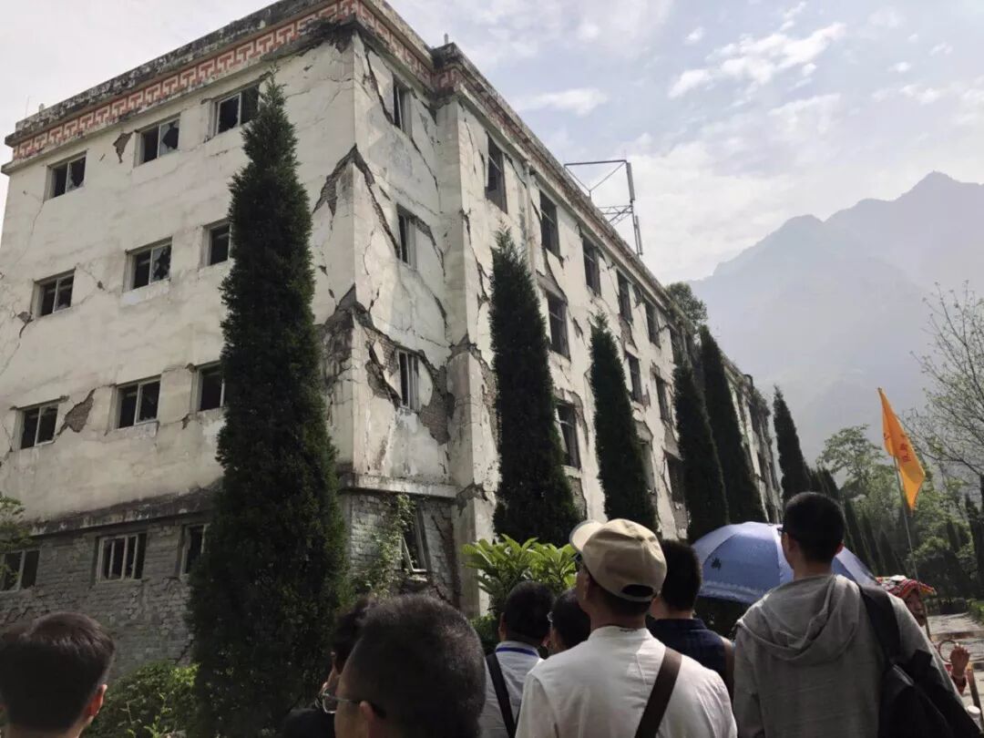映秀镇漩口中学位于汶川地震的震中,走进漩口中学大门,迎面就看到在地震中倾倒的教学楼废墟前,安放着一个四川汶川特大地震纪念表盘,被命名为“汶川时刻”,上面清晰地显示着地震发生的时间——下午两点二十八分。校园内到处都是断壁残垣,地震发生时倒塌的教学楼和学生宿舍楼都还按原貌保留着,看到由地震造成的巨大破坏和惨烈景象让人感到无比震惊,同时,我们也深深感受到了作为结构工程师所肩负的重大责任和使命。