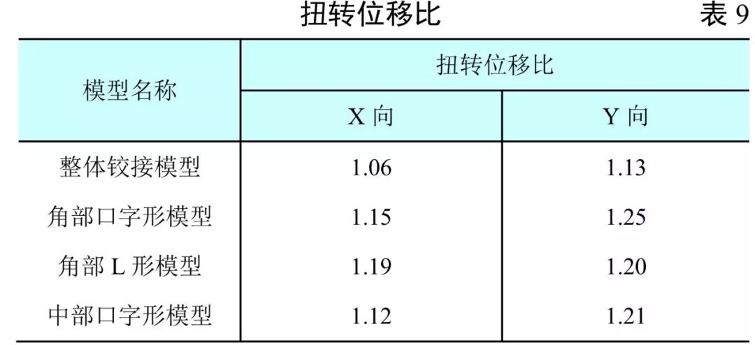 (1)周边4个口字形平面与中央的口字形平面依靠中央4个筒体竖向连接,平面内连接刚度很弱。4个周边单元和中央单元在地震作用下将各自相对独立地振动,整体性较差。同时这种连接方式使中央4个筒体受力复杂,以整体弯扭受力为主。
