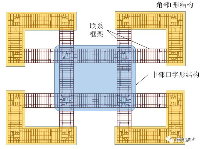 同样,结构亦可看作由中央4个筒体与框架形成的中央口字形结构单元与周围4个L形结构单元通过水平框架进行联系所构成(图10)。也应将中央口字形结构及角部的4个L形结构(图11)各自作为独立结构进行分析,并与整体模型分析结果取包络进行设计。