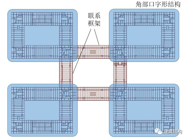 本工程整体性偏弱,从平面组合上看,结构角部4个筒体和框架形成了4个角部口字形结构单元。这4个结构单元通过中部的框架联系成整体结构(图9),形成横向连体结构。由于彼此间联系较弱,因此有必要将4个角部口字形结构单元作为独立结构单独进行分析,并与整体模型分析的结果取包络作为设计依据。