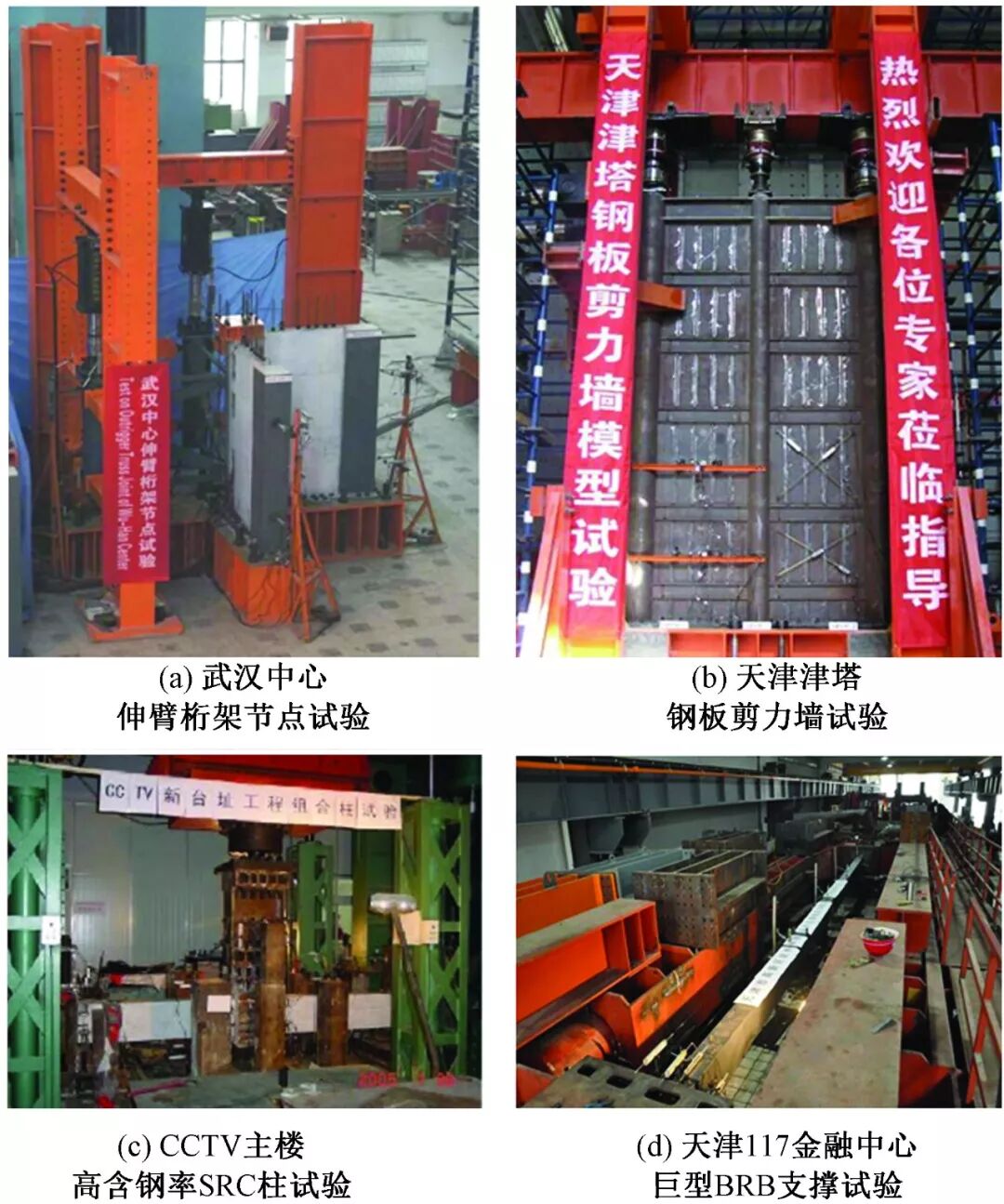ECADI和国内科研院所及高校合作,对超高层建筑工程中关键节点或新型结构进行了大量缩尺模型力学试验(图18),如上海环球金融中心巨型斜撑与巨柱连接节点、武汉中心伸臂桁架与核心筒的连接节点、CCTV大楼高含钢率SRC柱受力和变形性能以及蝶形节点受力性能、天津津塔考虑屈曲后效应钢板剪力墙的抗震试验、天津高银117大厦巨型BRB支撑受力与变形试验、巨型钢管混凝土组合柱防火性能试验、天津周大福蝶形铸钢节点试验等都取得了丰富的成果。国内其他设计及科研单位针对CFT巨柱钢和混凝土共同工作机理、钢管混凝土剪力墙、外包钢板剪力墙受力性能以及自复位结构等也进行了专项试验和研究。上述结构试验和专项技术研究成果对超高层建筑结构关键技术的应用或改进起了至关重要的作用,一方面确保结构安全、合理,有力地提升了工程项目的设计品质,另一方面也填补了国内设计规范或标准的部分空白并在其他工程实践中推广应用。