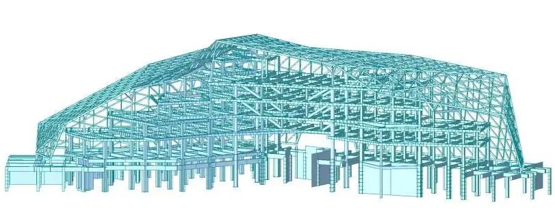 榆中生态创新城科创中心项目,分为地上孵化楼与地下展览中心两个部分,地上部分主体采用钢框架+折面网格结构;地下结构采用钢筋混凝土框架+外挡墙结构,顶板采用折面混凝土板拟合建筑的折面形草坡。结构存在平面凹凸、细腰、竖向收进等不规则,此外具有上下楼层旋转错落,大跨度空腹桁架,树形柱,地下高外挡墙(挡墙净高度12m)等特点。
