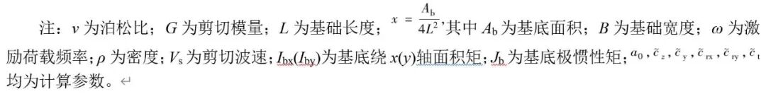 为准确评价地基土体的动力参数,获得地基三向平动、回转刚度及对应阻尼,《地基动力特性测试规范》(GB/T 50269—2015)[26]对基础动力参数的测试方法及要求做了明确规定,统一了工程中地基刚度的取值。