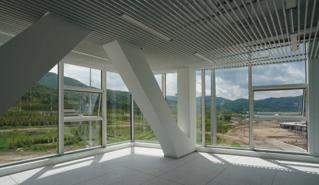 国家越野滑雪中心使用传统建筑施工为自下而上逐层施工,采用钢框架—中心支撑结构体系,完成地下一层、首层及中心支撑施工后,首先进行四层框架梁施工,随后施工桁架层及吊柱,最后施工悬挂的三层楼面梁。技术楼是整个中心的关键工程,外墙装饰采用了20毫米厚的玻璃纤维增强混凝土(俗称GRC板),可实现大面积板材预制,每块板材都是独立设计,工厂定制加工,现场直接安装,有效避免了建材损耗、现场污染。它的中空玻璃幕墙既便于裁判、技术官员观察赛场,又能更好满足场馆对于抗风压性、水密性、气密性的严格要求,减少室内冷气或热量散失的同时,还能降低空调负荷、减少能耗。