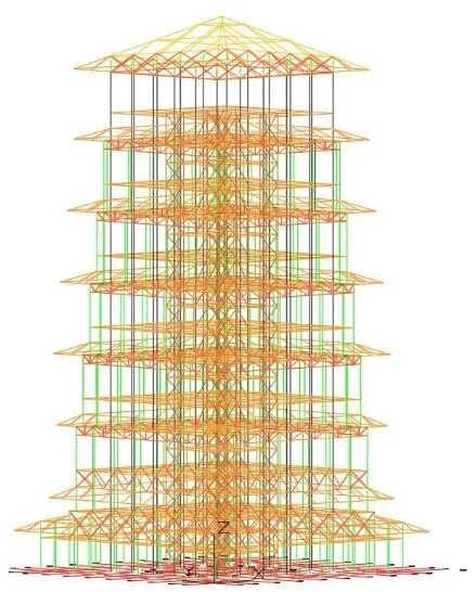 在第十一届全国地震工程学术会议正式召开前,将继续举办模拟地震振动台试验盲测竞赛。本次振动台试验以西安天人长安塔为原型结构,模型缩尺比例为1:15,结构形式:塔中心区域采用钢支撑-CFST柱核心筒,外围采用CFST柱-钢梁框架结构,同时,最外榀钢框架中布置腰桁架。原型实景图及模型示意图如下所示。