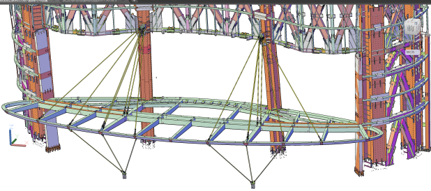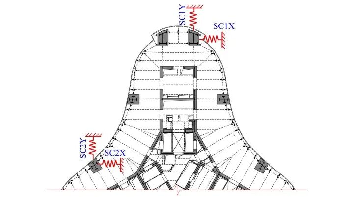 塔楼重力体系为:标准层采用钢梁+压型钢板组合楼板体系;加强层采用钢梁+钢筋桁架楼承板组合楼板体系;外框柱除12根巨柱外,其余巨柱间重力柱均立于环带桁架之上,并与上部环带桁架通过带长圆孔滑动节点连接。