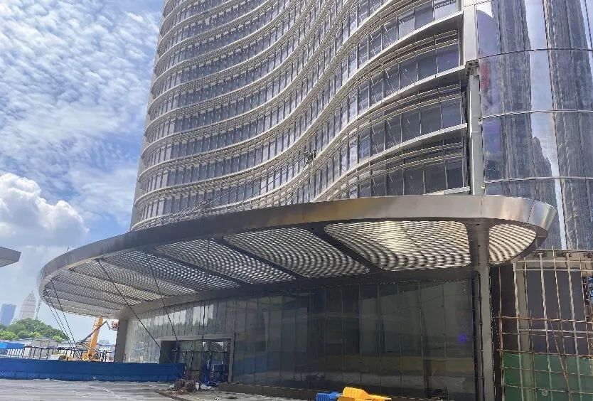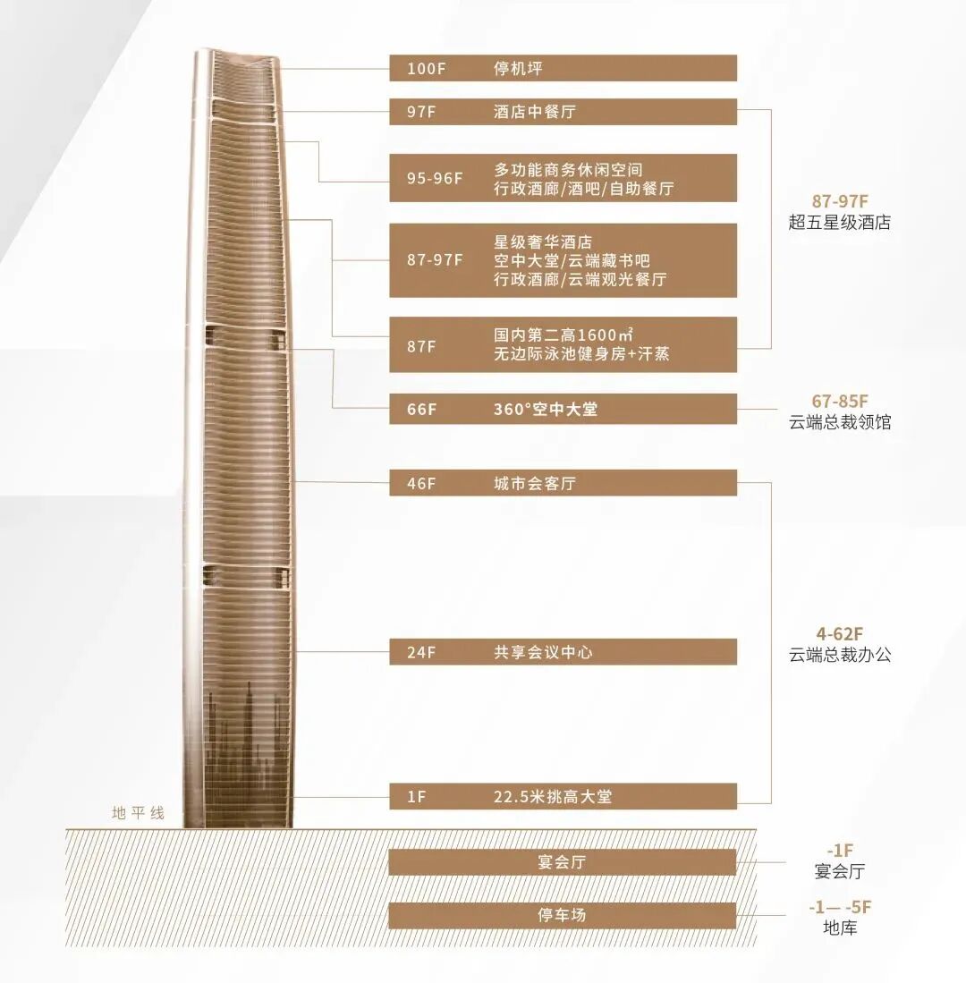 武汉绿地中心主塔楼地处武昌滨江商务区中心区域,为集办公、酒店等一体的超高层综合体。原设计高度为636m,2018年建筑设计进行了调整,现方案主塔楼建筑高度调整为475m,调整后地上总建筑面积约为29万m2,楼层数为99层,为华中第一高楼。建成后它以“长江会客厅”之姿,构筑起面向全球的招商运营平台,促进湖北全域协同发展。