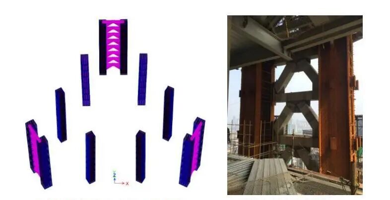 角部巨柱SC1间中心支撑三维模型及现场照片