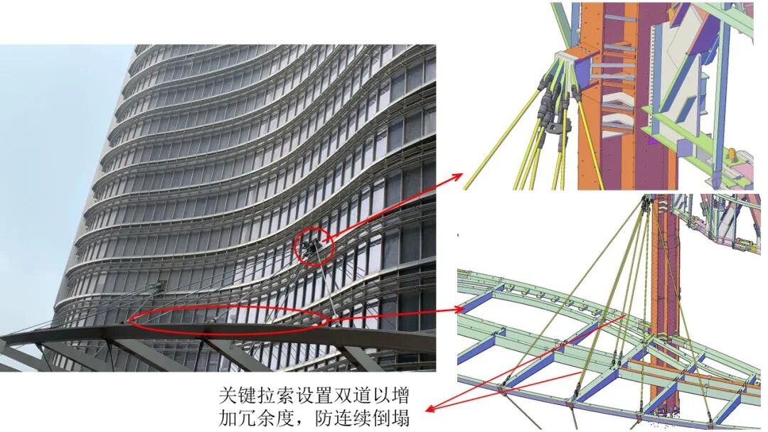 武汉绿地中心主塔楼在首层三边均设置大尺度雨蓬结构,其中北侧办公雨蓬平面尺寸达25m×70m,为中国最大的雨篷结构之一。主要的雨篷构件包括从巨柱SC2悬挑超过20m的方钢管梁,从边柱悬挑9m的方钢管梁,以及上下拉索组成,典型的雨蓬构件均为方钢管。雨篷上下均设置了拉索,是考虑上下拉索的张力可以更好地平衡大尺度雨篷承担的自重以及较大的风压与风吸力,同时拉索的设置也非常有效地减小了巨柱及边柱单悬挑引起的巨大弯矩。为了应对雨篷结构的防连续倒塌设计,雨篷构件适当预留了一定的冗余度,其中直接与巨柱SC2悬挑梁相连的上侧拉索设置了双索以进一步确保雨篷结构的安全。