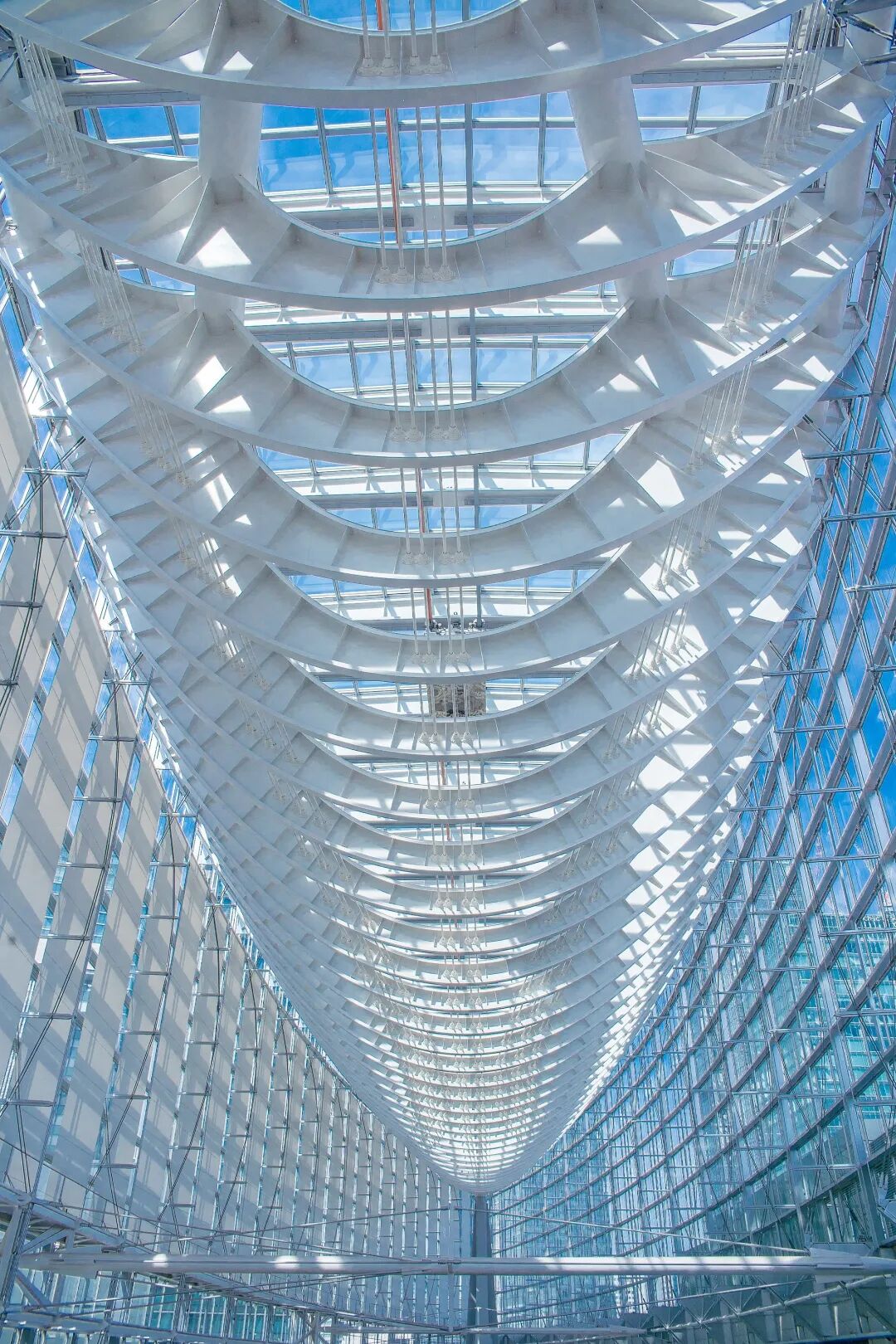 从我个人的感受而言,当代的一些年轻结构工程师,也许称他们为结构设计师更为贴切吧。他们似乎有着一种倾向,通过让结构的形态表现变得更为极端,来颠覆人们对结构的既有认知,例如他们会设计非常细、非常薄的结构形态。这在力学上也许是很安全的,但却表现出消除力流的感觉。请问竹内老师,您如何看待这种现象的?视觉上的危险不一定等于力学上的危险,有些结构虽然看起来危险,但在力学上还是有余量的。不过,确实有一些结构游走在力学安全性的边缘,以此创造视觉上的危险性,这是真实存在的。有些结构设计师可能认为,在满足规范的前提下可以追求极限,只要遵守了所有规定就不用负任何责任。但这样的想法很危险,因为规范不能涵盖自然力量的所有潜在因素,结构真正的主人是自然,你没有过问它的看法,那么它对你的惩罚会是很惨痛的。日本就有很沉重的教训,顶级结构设计师渡边邦夫③(Watanabe Kunio)先生在他的最后一个项目中,就是因为大胆的结构被地震所破坏,而影响了声誉。因此,建筑师在表达个性时,不仅要遵守规范,还要倾听自然的要求。▲ 渡边邦夫代表作东京国际会议中心室内 ©Dick Thomas Johnson