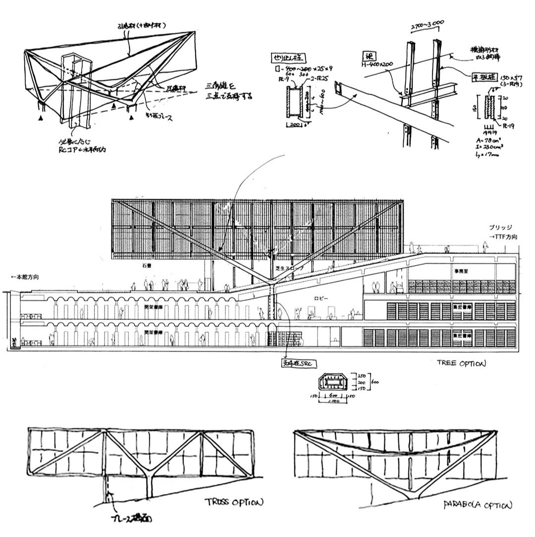 尽管也存在与设计无关,主要从事着建筑技术工作的建筑工程师(Architectural Engineer),但人们普遍认为建筑师是对建筑设计师的称呼。结构工程师可以进行的设计或创新与建筑师并不相同,并且在很大程度上,结构工程师会意识到他们是为建筑师提供服务的角色。建筑师的工作方式是从无到有的形态创立,可依据的原则繁多,可以有很大的发挥余地。而结构工程师则有着相对明确独立的力学原理作为依据,可以发挥的余地非常有限。建筑与结构这两种工作方式所产生的矛盾是显而易见的。在这其中通过彼此的磨合与沟通来获得共识是相互依存的重要基础。这也就是刚才周总讲到了的,结构工程师应该把结构原理传达给建筑师,当然也需要建筑师明白这些结构原理之中的可能性。我想请问两位,在设计的不同阶段,或者针对不同的对象、不同的规模、不同的用途,你们是否会选择不同的方式与建筑师进行沟通?我想通过与东工大三位建筑教授分别合作的项目,来说明具体的沟通方式。第一个项目是与安田幸一(Yasuda Koichi)教授合作的东工大附属图书馆。在项目的初始阶段,我正好和安田教授一起去巴西出差,参观了奥斯卡·尼迈耶(Oscar Niemeyer)的建筑。当时的总体规划已决定把图书馆的主体部分设在地下,地上部分是一个三角形体量。安田教授希望三角形体量漂浮在空中,并在其下方设置地下部分的入口。在我们商量的时候还没有具体的结构意象,但明确地提到不希望在架空部分出现柱子。在初步设计的图纸上我展示了几种不同的支撑方式,建筑师最终选择了最简洁的V形梁方案。在这个项目中,我从早期的方案设计阶段就开始参与,并在确定设计方向后持续跟进。