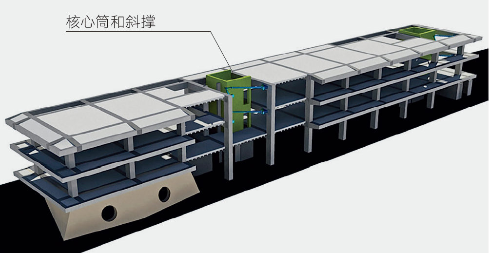 最后一个项目是与塚本由晴(Tsukamoto Yoshiharu)教授合作的地球生命科技研究所。塚本教授在方案阶段没有考虑结构因素,基本完成设计后才开始和我探讨结构问题:如何实现一层报告厅的双曲抛物面墙体;如何仅用两根柱子支撑上部空间,灵活应对不同的空间布置需求。为了避免上部两层遭受地震力的破坏,我将主体结构分为两个部分,在它们之间布置吸收地震能量的核心筒和斜撑,但在建筑空间中看不到这些结构体。这是协助建筑师实现其设计,解决结构问题的合作方式。©东京工业大学竹内研究室