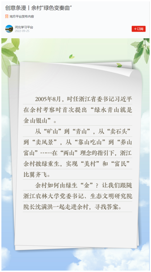 9月25日,校党委书记、国家“万人计划”哲学社会科学领军人才,校生态文明研究院院长、首席专家沈满洪教授接受“学习强国”采访,解读余村“绿色变奏曲”。