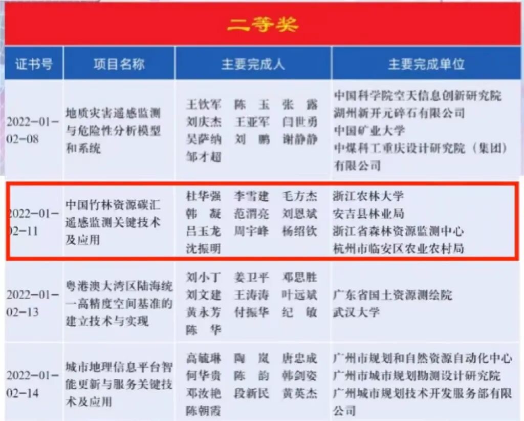 近日,中国测绘学会科学技术奖励委员会公布了2022年测绘科学技术奖获奖名单,国家重点实验室森林碳汇研究团队主持完成“中国竹林资源碳汇遥感监测关键技术及应用”获二等奖。