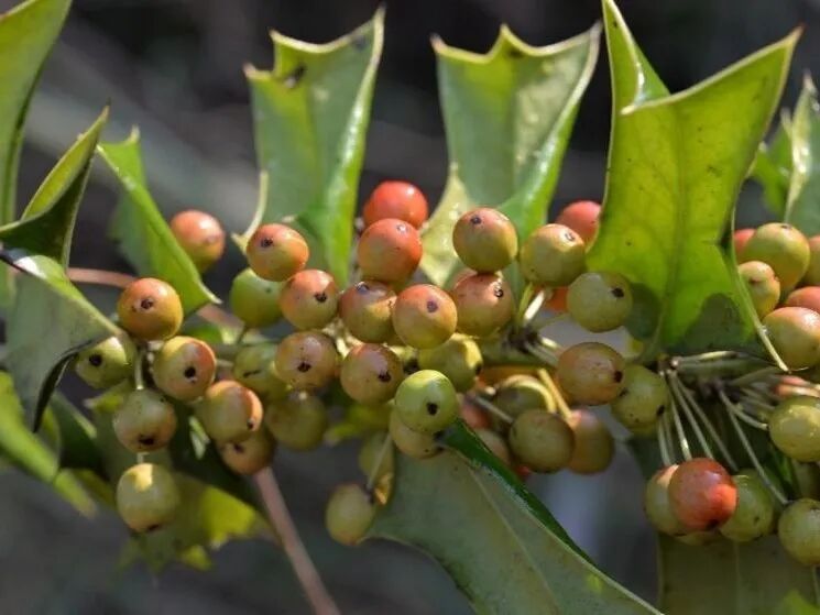 常绿灌木或小乔木。叶片四角状长圆形或卵形,(4~9)cm×(2~4)cm,先端具3枚尖硬刺齿,中间一枚常反曲,基部圆形或近截形,两侧各具1~2刺齿;叶柄上面具狭沟;托叶胼胝质,宽三角形。花序簇生于二年生枝的叶腋内;花淡黄色,4基数。果球形,鲜红色。花期4~5月,果期10~12月。