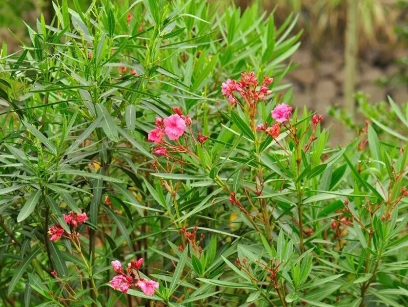 常绿灌木。嫩枝具棱。叶3~4枚轮生,下部者多对生,条状披针形,先端急尖,基部楔形,叶缘反卷,(11~15)cm×(2~2.5)cm,叶背有多数洼点;中脉在叶面陷入,在叶背凸起,侧脉直达叶缘;叶柄内具腺体。聚伞花序顶生;花红色、粉红色,或白色至黄色,花冠喉部具5片宽鳞片状副花冠。蓇葖果2,离生,具细纵条纹。花期6-10月,果期12-翌年1月。