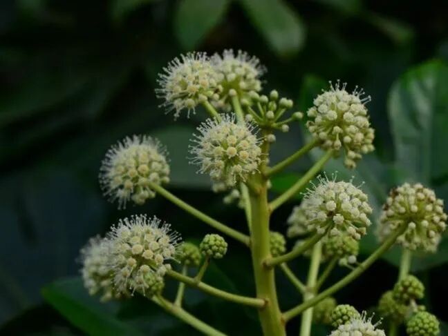 常绿灌木。叶片革质,近圆形,掌状7~9深裂,裂片长椭圆状卵形,先端短渐尖,基部心形,边缘有疏离粗锯齿。伞形花序再成圆锥花序,顶生;花黄白色。果实近球形,熟时黑色。花期10~11月,果期翌年4月。