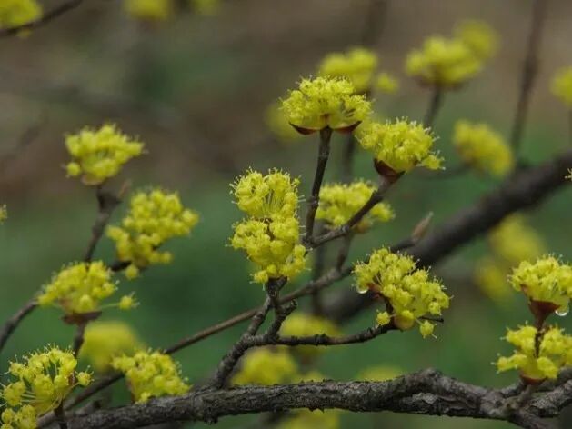 落叶小乔木或灌木。叶对生,纸质,卵状披针形或卵状椭圆形,(5.5~10)cm×(2.5~4.5)cm,先端渐尖,基部宽楔形或近于圆形,下面脉腋具黄褐色簇毛,侧脉6~7对,弧形;叶柄有浅沟,被疏柔毛。伞形花序生于枝侧顶;花小,黄色,先叶开放。核果长椭圆形,红色至紫红色;核具肋纹。花期3~4月,果期9~10月。