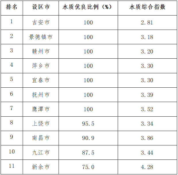11个设区市国考断面水质排名1-11位依次为:吉安市、景德镇市、赣州市、萍乡市、宜春市、抚州市、鹰潭市、上饶市、南昌市、九江市、新余市。