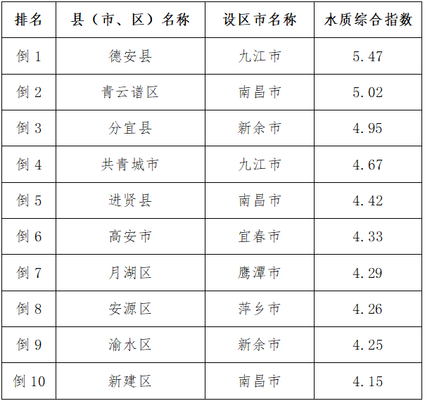全省100个县(市、区)水质综合指数排名前10的依次为:铜鼓县、上犹县、井冈山市、泰和县、婺源县、靖安县、遂川县、永新县、安福县、青原区;排名后10的依次为:德安县、青云谱区、分宜县、共青城市、进贤县、高安市、月湖区、安源区、渝水区、新建区。