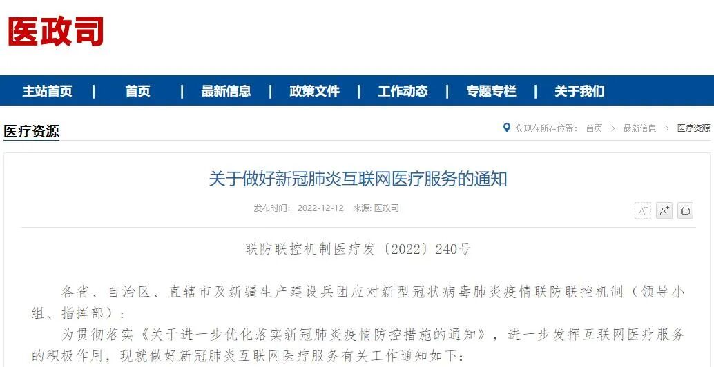12月12日,国家卫健委官网发布《关于做好新冠肺炎互联网医疗服务的通知》。