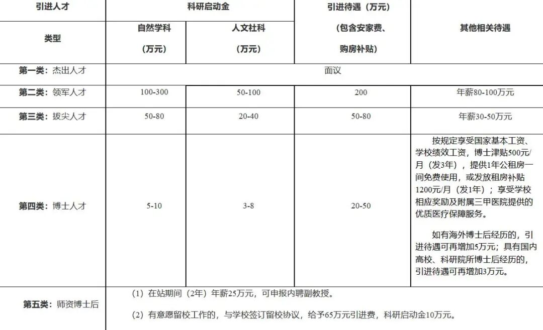 B | 杰出人才 | 140万-160万 | 1.住房补贴、安家费人民币200万元; 2.科研启动经费人民币300-400万元(人文社科类80-100万元); 3.提供两年期校内过渡房一套(80平米以上,免房租); 4.安置配偶工作。 |