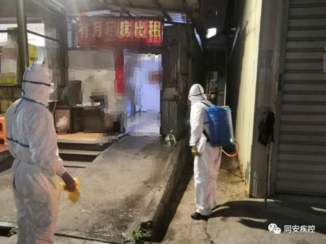 消杀组专业人员背着40多斤重的消毒设备至一例疑似病人的家中开展终末消毒工作。