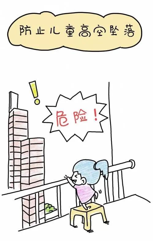 包括坠床、从凳子桌子上掉下来,甚至坠楼。窗户下面、阳台等处不要堆放可以攀爬的物品;要时常整理房间,祛除危险因素,如容易绊倒的电线,洒落在地上的水,卷起的地毯等,以防止儿童因为蹦蹦跳跳而摔倒。