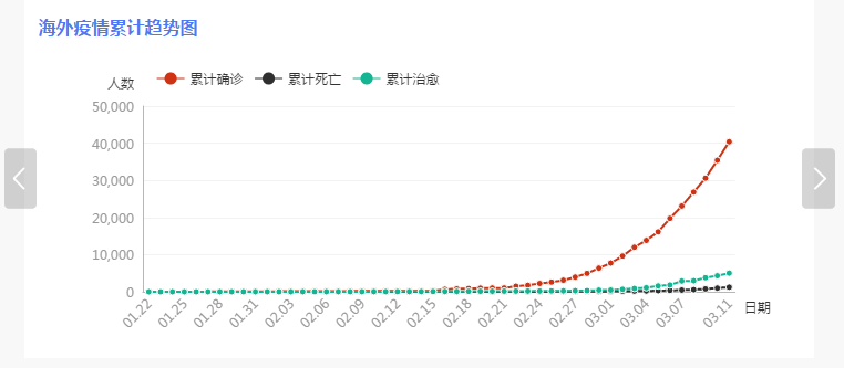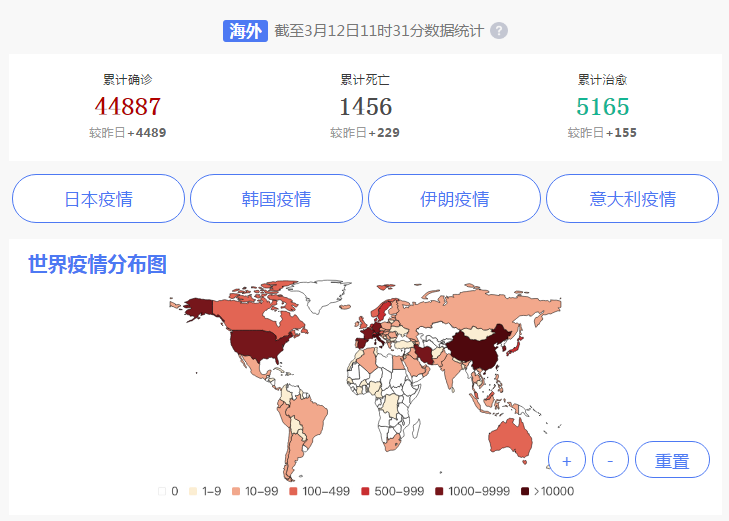 截止北京时间3月12日11时,中国境外共110个国家/领地/地区确诊新冠肺炎,累积确诊44887例,累积死亡1456例。